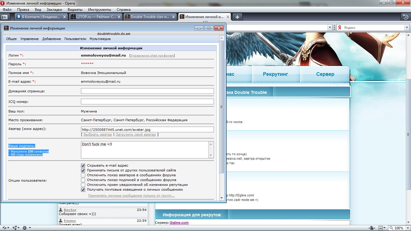 | Анкета - О себе: 1. Ваше имя и возраст.Илья 19 2. Город, в котором вы проживаете и его часовой пояс.Москва GMT+3 3. Работаете/учитесь/совершенно свободен и т.п., укажите здесь ответ. Работаю, после 19 00 (если договорюсь с новым боссом) уже дома (сейчас с 20 00) 4. Напишите о себе, как личность, как игрок и всё что вы считаете нужным.Работаю и учусь, люблю приятные компании и взаимное общение 5. Укажите вашу контактную информацию (icq или мобильный номер) 472383358 - О персонаже 1. Ваш ник в игре, профессия и уровень персонажа. пока нет (предположительно ШК, ФР) 2. Имеете ли вы сабклассы(отпишите их и лвла), нублес, статус хиро. нет 3. Ваше время игры, отпишите наибольшее время с и до в которое вы играете каждый день.с 20 00 до 02 00. иногда получается пораньше (как с работы ухожу) 4. Вы даёте свое слово что вы прочли от и до "устав" клана? Play hard go pro 5. Есть ли у вас микрофон? Вы готовы во время игры находиться в TeamSpeak3 ?да 6. Почему вы решили вступить к нам в клан? Отпишите по подробней. желаю найти хороших людей на хорошем сервере=) + на форуме хороший рекламный ход, а я это ценю, ну и в доверешение всего это устав - шикарно ИМХО 7. Какой период времени вы играете в Lineage 2? На каких серверах вы играли, их рейты и чего за всё время в la2 вы добились? играю с интерлюда начинал на абисе потом еще гдето и еще, потом офф Luna потом стало жалко деньги там ничего особенного не добился, были всякие пвп сервы, даже пару раз хиро был=) на старом GlobalWar-е был ПЛом луко пачки. 8. Вы были клан лидером или пати лидером?был ПЛом луко пачки 9. В каких кланах вы играли ранее за всё ваше время игры в ла2?Enku, Miracle, Tamplier всего 2 в основном играл с друзьями, даже пытался разок свой клан сделать, но увы=( 10. Ваш эквип (армор, бижа, пуха), подробно, с заточкой -------- 11. Налог устраивает?да (заплати налоги и спи спокойно=)) 12. Скрины того что вы добивались в ла2если найду что нибудь на стром компе то обязательно похвастаюсь=) (новый недавно приобрел)